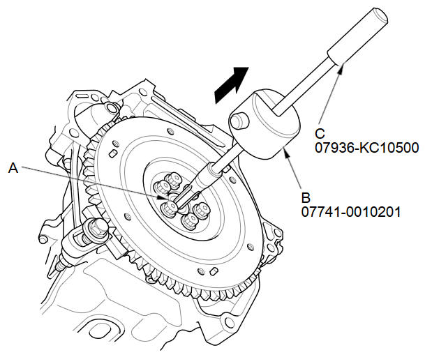 Remove the crankshaft pilot bearing (A) using the remover weight (B), and the 15 mm bearing remover shaft set (C).