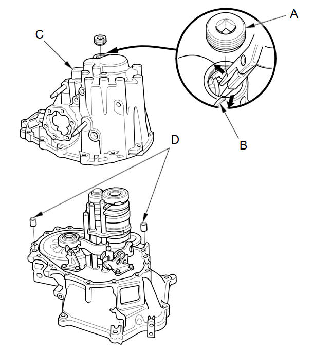 Remove the transmission housing (C) and 14 x 20 mm dowel pins (D).