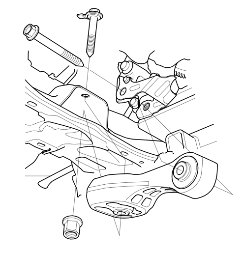 Slowly lower the transmission. Check once again that all hoses and wire harnesses are disconnected and free from the transmission, then lower it completely. Remove the two dowel pins.
